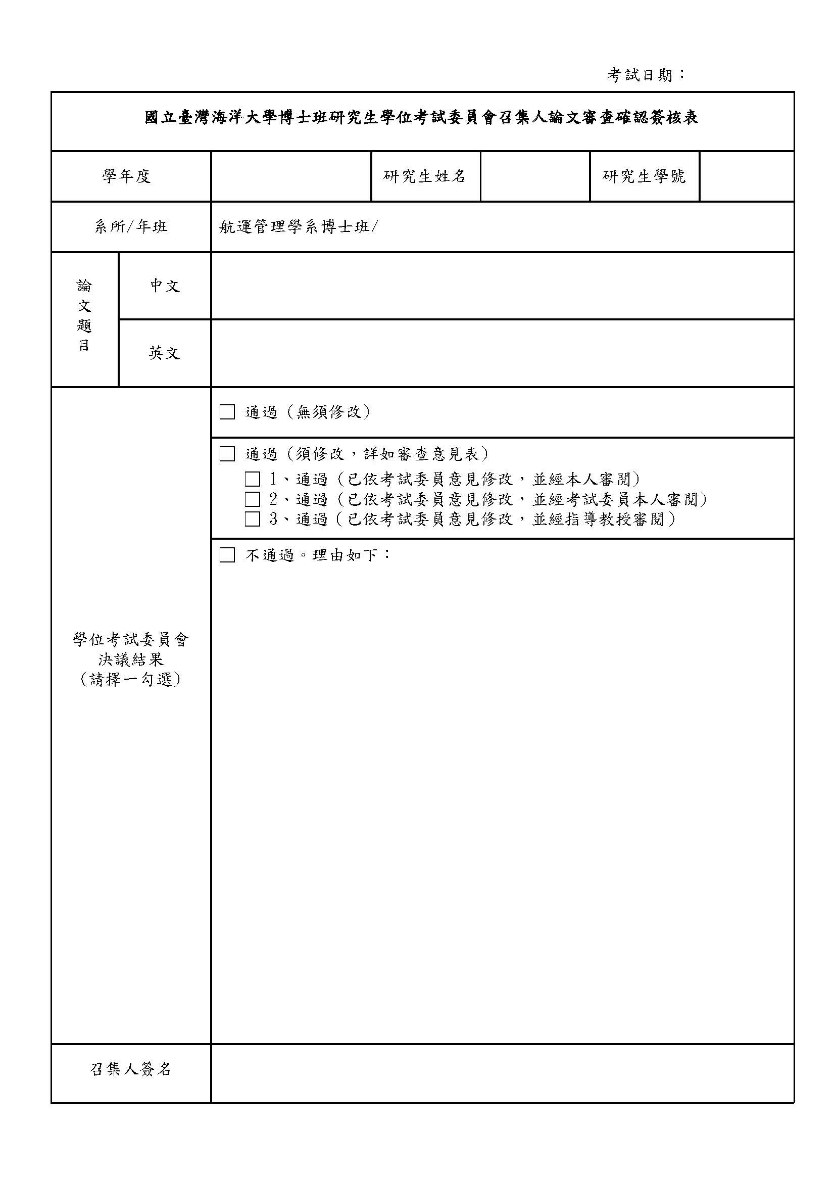 學位考口試申請提交後,系上會召開博士暨碩士審查委員會進行審查,審查通過後再經院、校審查通過,最侯由校方核發學位考口試委員聘書。