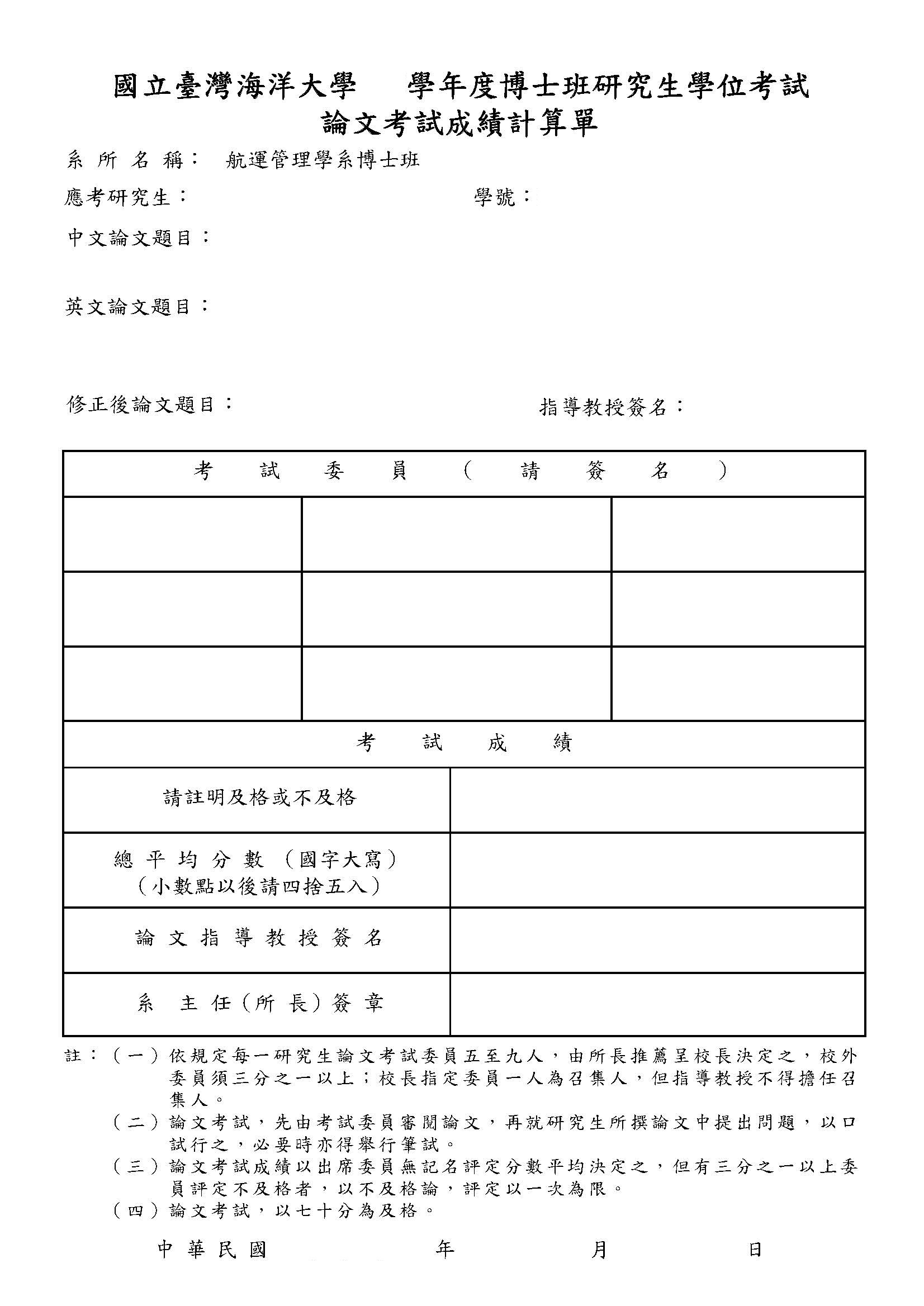 一、論文考試申請書一式兩份(於教學務系統上申請並列印)。